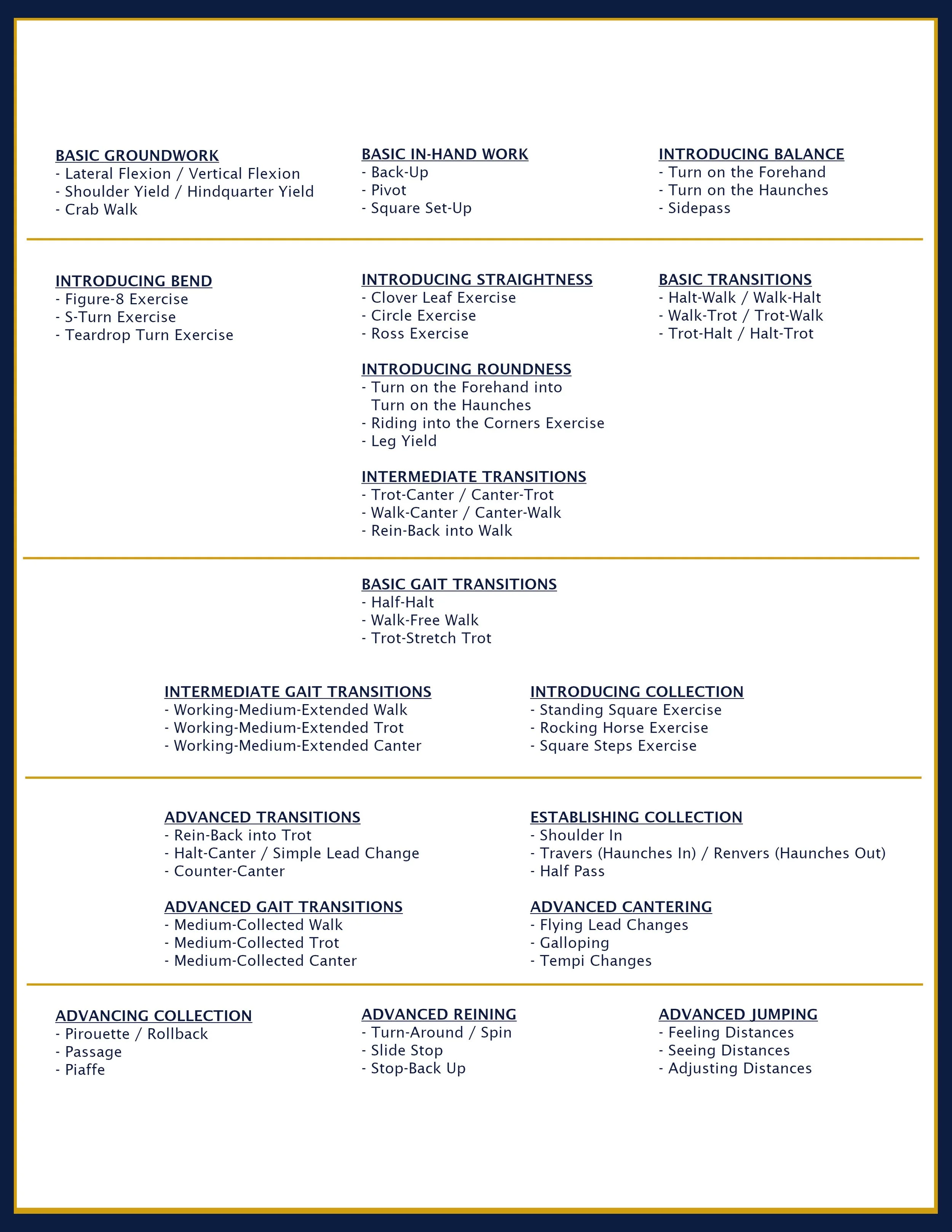 The development of the horse’s response to the rider’s aids through established connection, which advances the horse’s skill, utlity and versatility.